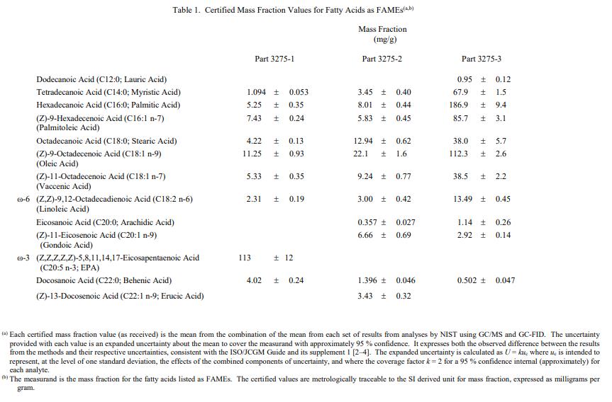 表 1 中提供了脂肪酸的認(rèn)證質(zhì)量分?jǐn)?shù)值。NIST 認(rèn)證值是 NIST 對其準(zhǔn)確性有最高置信度的值,因為所有已知或可疑的偏差來源都已被調(diào)查或采用考慮[1]。 NIST 使用兩種獨(dú)立的方法對賦值進(jìn)行了分析。所有認(rèn)證值均計算為每個平均值的平均值方法。相關(guān)的不確定性以 95% 的置信水平表示 [2-4]。值以質(zhì)量分?jǐn)?shù)單位 [5] 以收到的形式報告。