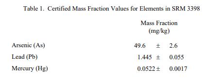 表 1 提供了 SRM 3398 中基于干質(zhì)量報(bào)告的痕量元素認(rèn)證質(zhì)量分?jǐn)?shù)值。NIST 認(rèn)證值是 NIST 對(duì)其準(zhǔn)確性有最高信心的值已知或可疑的偏倚來(lái)源已被調(diào)查或考慮 [1]。價(jià)值分配分析由 NIST 和合作實(shí)驗(yàn)室進(jìn)行。認(rèn)證值計(jì)算為 NIST 方法平均值的未加權(quán)平均值和合作實(shí)驗(yàn)室平均值的加權(quán)中值(在適當(dāng)?shù)那闆r下)。相關(guān)的不確定性以大約 95% 的置信水平表示 [2-5]。