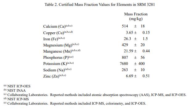表 1 和表 2 中提供了以干質(zhì)量為基礎(chǔ)報告的奎尼酸和元素的認證質(zhì)量分數(shù)值。NIST 認證值是 NIST 對其準確性有最高置信度的值所有已知或可疑的偏差來源都已被考慮在內(nèi) [1]。價值分配分析由 NIST 和合作實驗室進行。認證值計算為