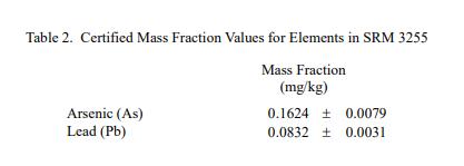 水分測定:SRM 3255 的水分含量在 NIST 通過 (1) 在 7 天內(nèi)冷凍干燥至恒重進行測定; (2) 用高氯酸鎂在干燥器中室溫干燥28 d; (3) 在 80 ℃的強制通風烘箱中干燥 2 h。對使用所有三種技術獲得的未加權結(jié)果進行平均,以確定 (0.9687 ± 0.0055) 克干質(zhì)量/克原樣質(zhì)量的轉(zhuǎn)換因子,用于將數(shù)據(jù)從原樣轉(zhuǎn)換為干質(zhì)量;此值上顯示的不確定性是擴展的不確定性 (k = 2),代表 95% 的置信水平。從水分測量中獲得的轉(zhuǎn)換因子 (0.28 %) 的不確定度部分包含在認證值和參考值的不確定度中,以干質(zhì)量為基礎報告,在本證書中提供。