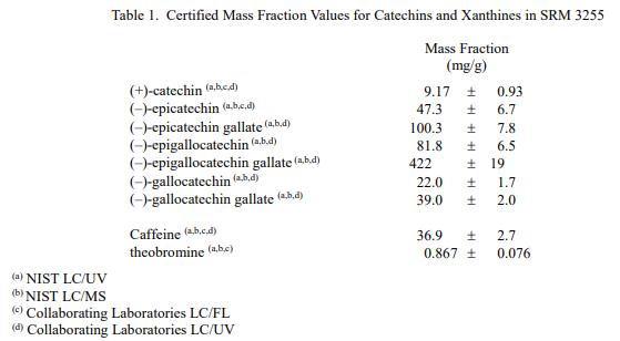 表 1 和表 2 提供了 SRM 3255 中兒茶素、黃嘌.呤和元素的認證質(zhì)量分數(shù)值,以干質(zhì)量為基礎報告。NIST 認證值是 NIST 具有最高置信度的值在其準確性方面,所有已知或可疑的偏差來源都已被調(diào)查或考慮 [1]。價值分配分析由 NIST 和合作實驗室進行。兒茶素和黃嘌.呤的認證值是各組結(jié)果的同等加權平均值;元素的認證值計算為 NIST 方法的平均值的平均值和合作實驗室提供的結(jié)果平均值的中位數(shù)(如果適用)。相關的不確定性以大約 95% 的置信水平表示 [2-4]。