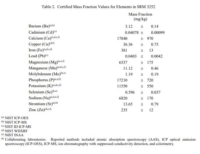 使用方法:使用前,應(yīng)將包中的內(nèi)容物充分混合。打開前應(yīng)讓內(nèi)容物靜置一分鐘,以盡量減少細(xì)顆粒的損失。對于小于以下 NIST 方法使用的樣本大小,尚未評估材料的均勻性。因此,認(rèn)證值和參考值對于小于以下部分所述的測試部分可能無效:元素分析 0.2 克至 4 克,脂肪酸分析 1 克,膽固醇分析 0.5 克,以及 1 克至 5 克g 用于維生素分析。在分析中獲得的結(jié)果應(yīng)該包括他們自己對不確定性的估計,并且可以使用參考 5 中描述的程序與認(rèn)證值進(jìn)行比較。 水分測定:SRM 3252 的水分含量在 NIST 通過 (1) 冷凍干燥至恒定質(zhì)量超過7天; (2) 用高氯酸鎂在干燥器中室溫干燥20 d; (3) 在 80 ℃的強(qiáng)制通風(fēng)烘箱中干燥 3 h。對所有三種技術(shù)的平均結(jié)果進(jìn)行平均,以確定每克原樣質(zhì)量的 (0.9502 ± 0.0038) 克干質(zhì)量比例;此值上顯示的不確定性是大約 95% 置信水平的擴(kuò)展不確定性。用于將數(shù)據(jù)從原樣轉(zhuǎn)換為干質(zhì)量基礎(chǔ)的轉(zhuǎn)換因子是干質(zhì)量比例的倒數(shù)。從水分測量中獲得的轉(zhuǎn)換因子 (0.2 %) 的相對不確定度部分包含在認(rèn)證值和參考值的不確定度中,以干質(zhì)量為基礎(chǔ)報告,在本證書中提供。